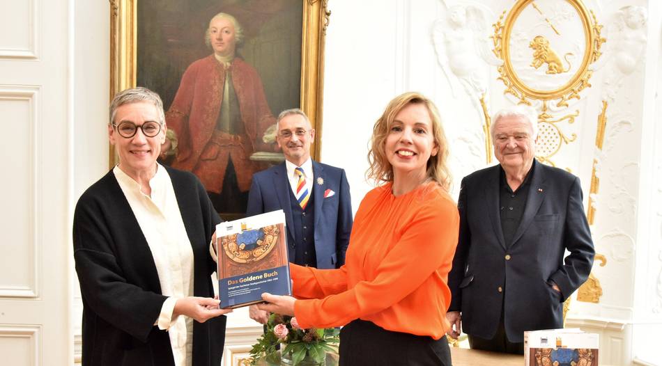 Stolz auf das gelungene Werk: Oberbürgermeisterin Sibylle Keupen (von links), AKV-Präsident Werner Pfeil, Historikerin Ines Soldwisch und Georg Helg vom Rathausverein stellen das Buch über das Goldene Buch vor. Foto: Andreas Herrmann